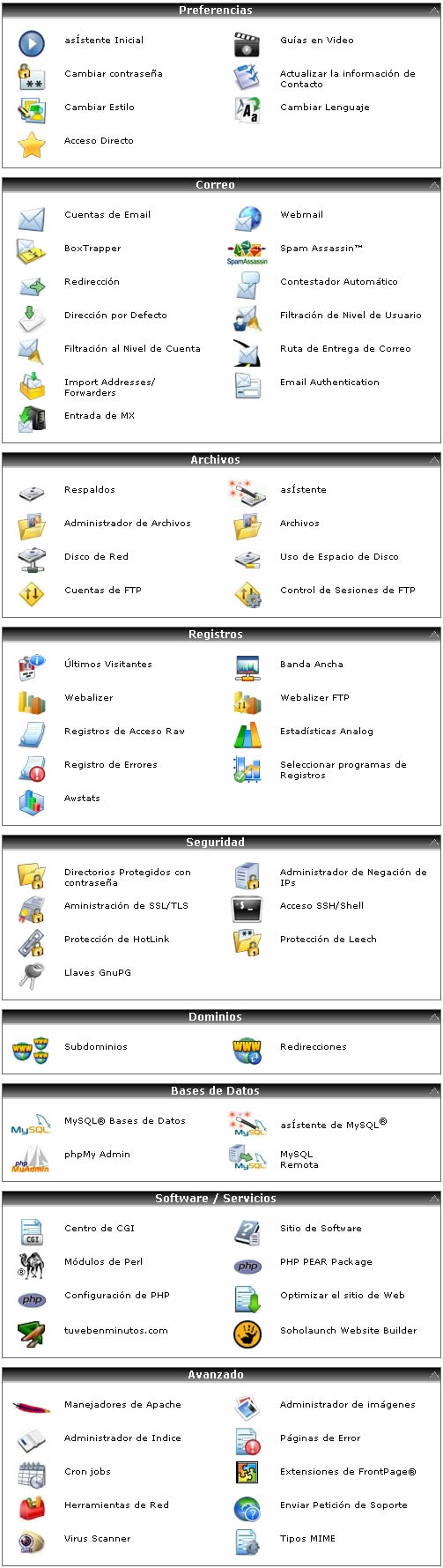 Todas las características ofrecidas dentro del servicio de Hosting, son administradas con la herramienta cPanel. Dentro de las principales características se puede observar: